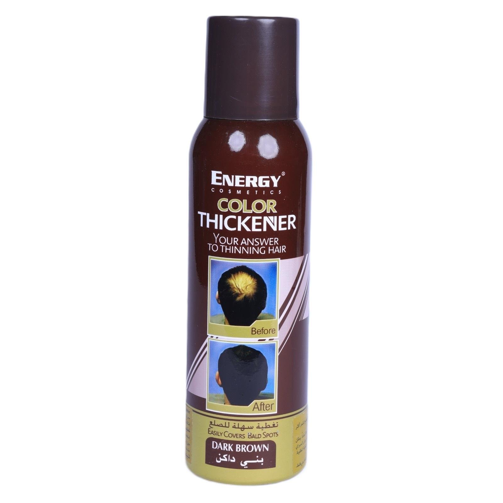 - Energy Cosmetic hair Color Thickener Spray easily covers bald spots as it fills in thinning areas of hair and cover grey hair.